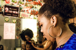 ![]() No salão Fast Braids, Sandra Nascimento, a "Tia", separa alguns fios de lã para trançar uma cliente - Foto: Gabriela Isaias | ![]() No dia do aniversário de um ano do salão, a equipe fez preços promocionais que impulsionaram uma grande procura pelos serviços - Foto: Gabriela Isaias | ![]() Sandra aplica o "entrelace" em uma cliente. O método consiste em costurar mechas teladas na trança nagô, rente ao couro cabeludo - Foto: Gabriela Isaias |